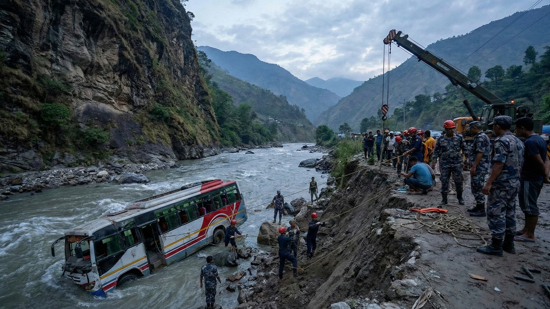 A passenger bus plunged into a river in Dhading, Nepal, killing 18 people and injuring several others. Rescue teams recovered bodies and rushed survivors to hospital. The uthorities are investigating the cause as locals and emergency crews search and provide relief.