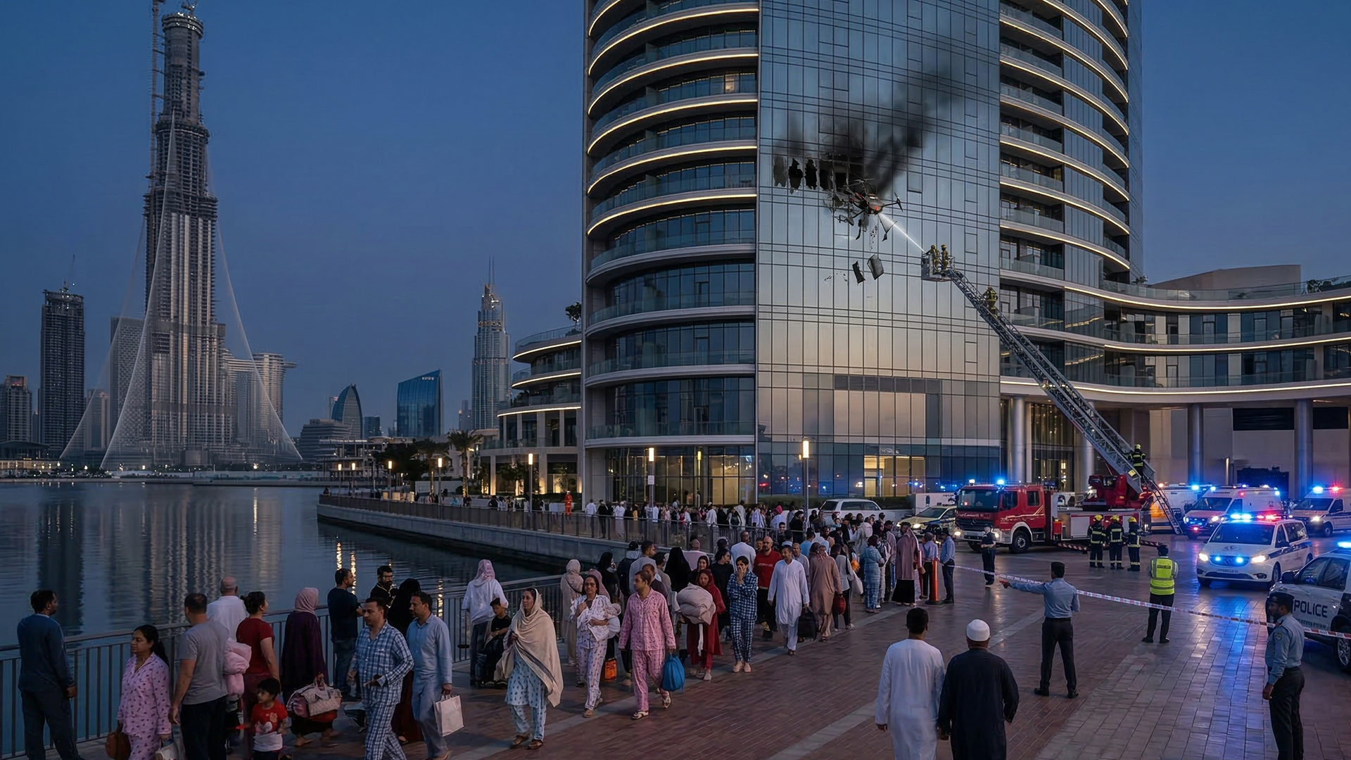 A drone struck a luxury residential tower in Dubai Creek Harbour, causing a fire and forcing residents to evacuate the building. Emergency…